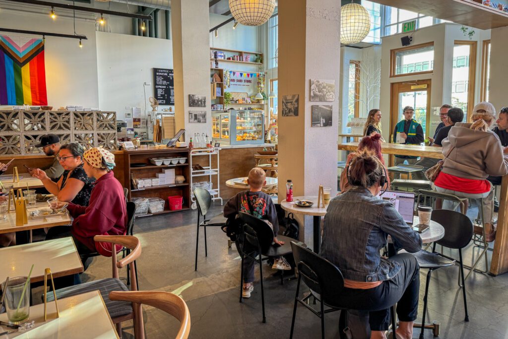 They have a couple of cafes in Seattle, but you should go to the one downtown (here on Google Maps), which is a cool indoor/outdoor space taking up the first floor of the building that reminds me of a train station or a fancy British library (or just Suzalo Library at UW).