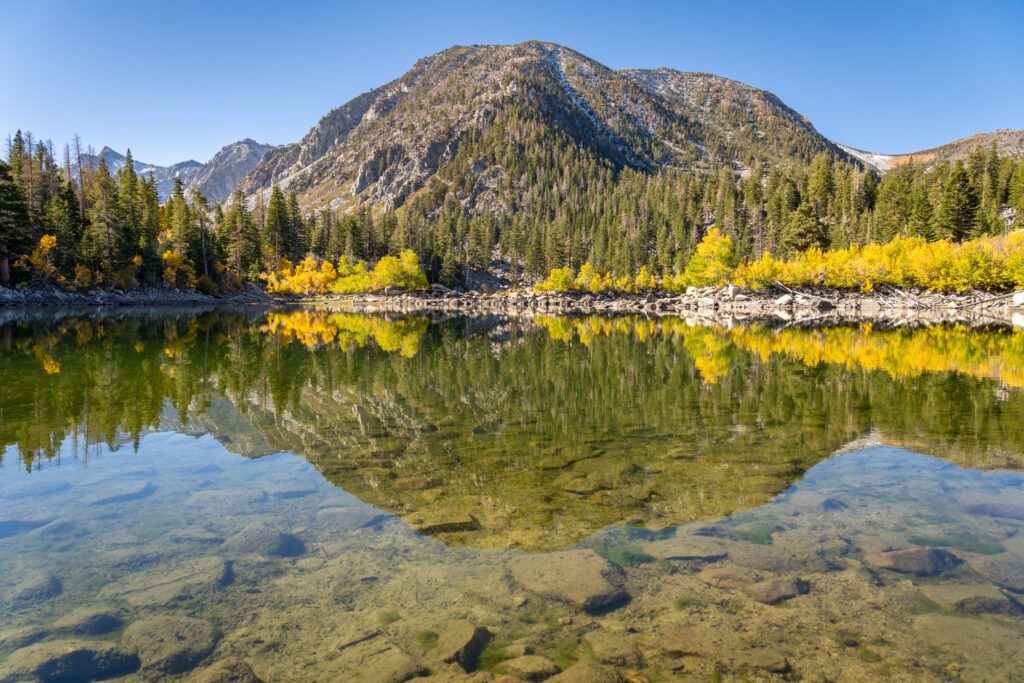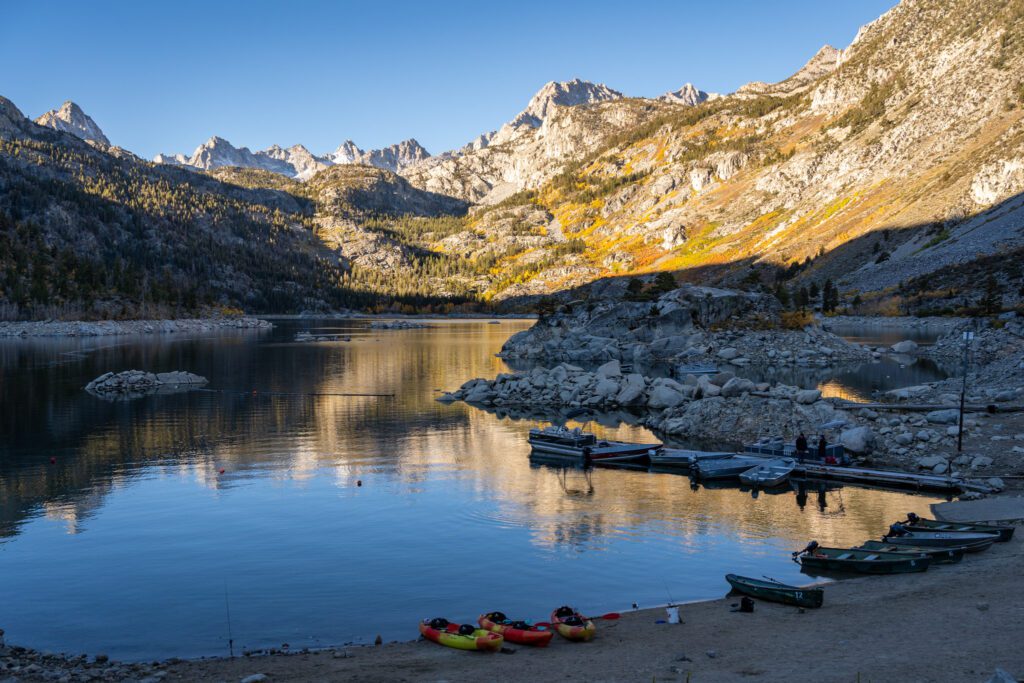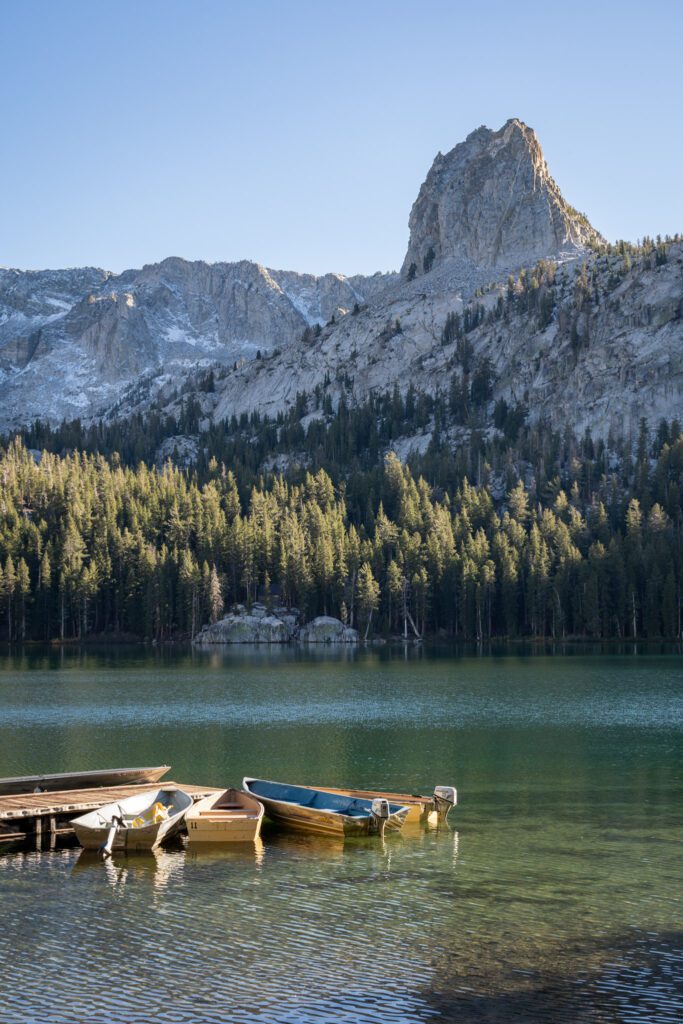 The lake is popular with adventurous anglers, and is home to brook and rainbow trout along with a golden trout hybrid. Climbers, meanwhile, head straight to the 10,364-foot Crystal Crag, home to a variety of alpine, sport, and trad climbing routes.