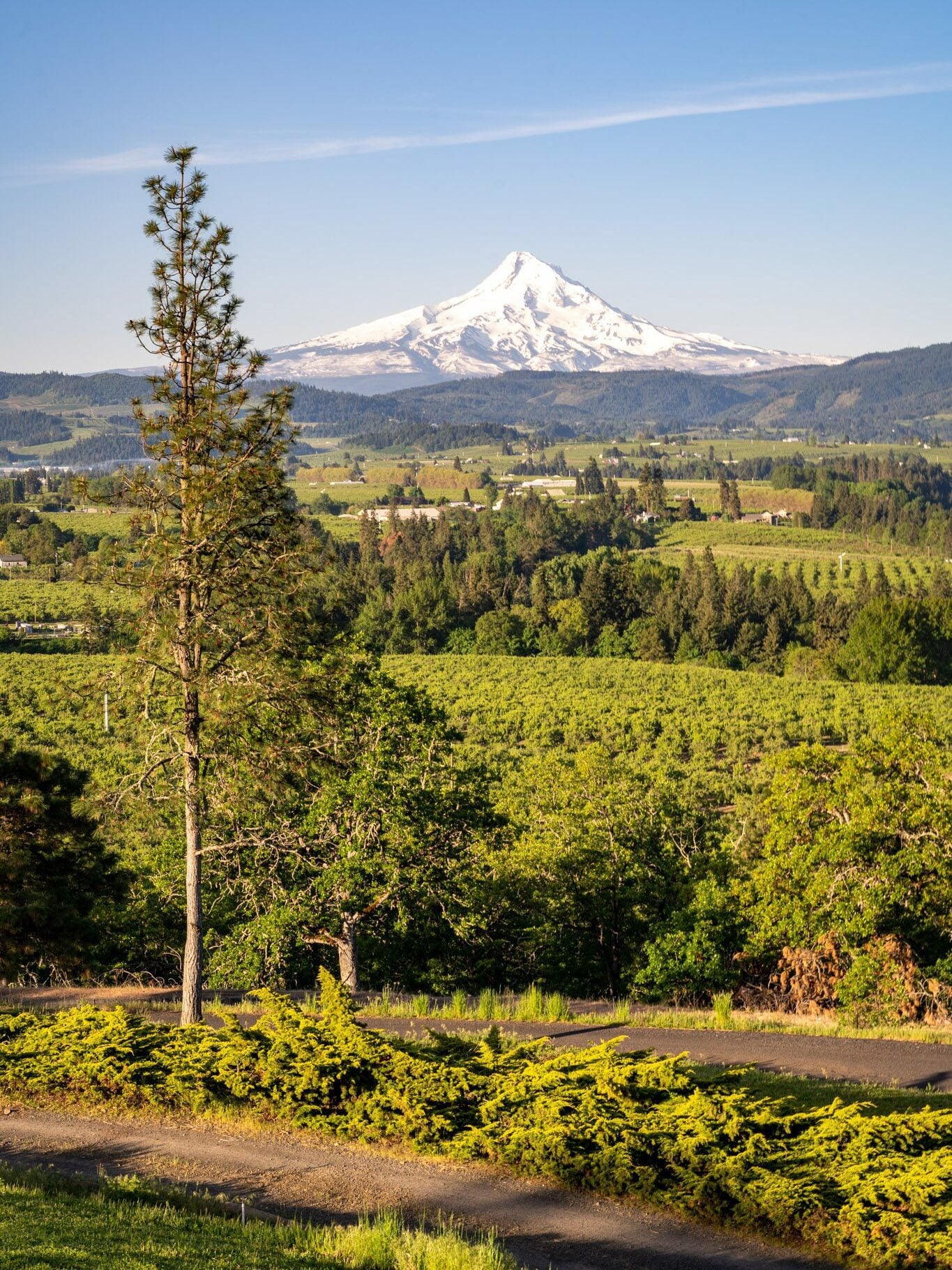 This time, head south out of Hood River into the fertile valley that sits between Mount Hood and Hood River, the Hood River Valley, where vines and fruit trees are backed by picturesque rolling hills and Mount Hood’s snowy peak in the distance.